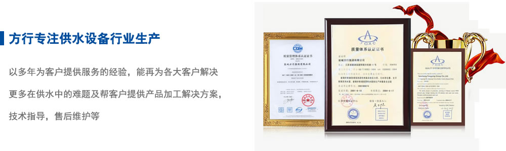鹽城方行集團有限公司秉承“務實、誠信、拼搏、創(chuàng)新”的企業(yè)精神,經歷了近數(shù)十年的歷程取得了跨越式的發(fā)展。高起點才會有更高的品質,優(yōu)雅的環(huán)境,先進的設 備,高效的團隊,造就了一批批優(yōu)質的產品。堅持質量、用戶至上的宗旨,公司全面通過了ISO國際質量體系認證,是制造供水成套設備廠家 之一。經悉心打造,已享有較高的知名度,產品遍布全國,不斷研發(fā)全新產品,滿足消費者的需求 | |
